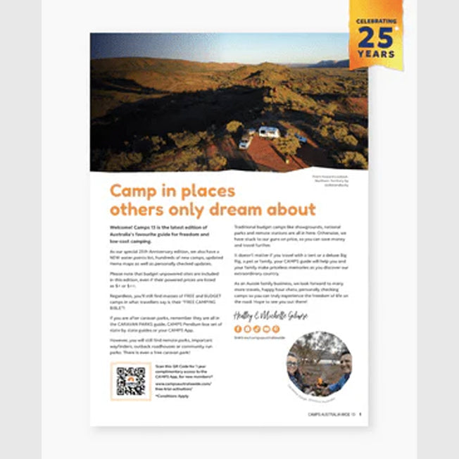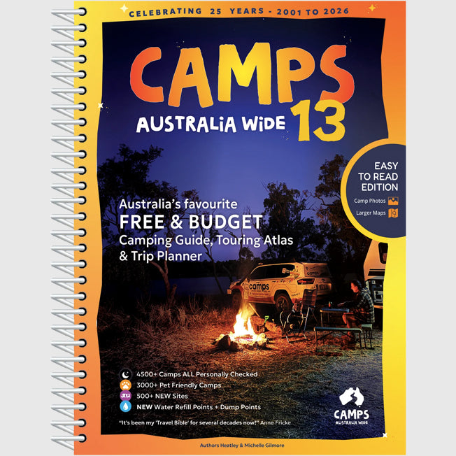 The Camps 13 Easy to Read Edition (B4) features over 4,250 free and low-cost campsites across Australia — including 500 new sites — all personally checked by the Camps Australia Wide team. This special 25th Anniversary Edition includes full-colour campsite photos and larger maps for easy reading, making it perfect for travellers who want both detail and convenience.